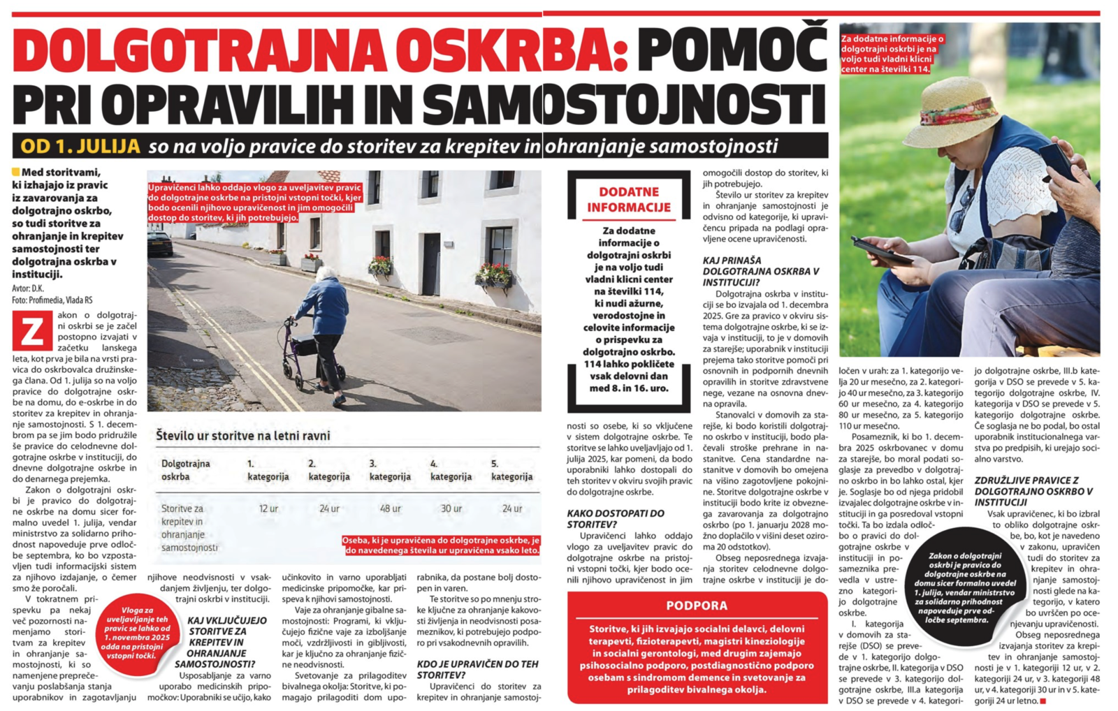 Zakon o dolgotrajni oskrbi odpira novo poglavje v skrbi za starejše. Po uveljavitvi pravic do oskrbe na domu (1. julij 2025) in e-oskrbe bo od 1. decembra 2025 na voljo tudi celodnevna institucionalna oskrba, dnevna oskrba in denarni prispevek.